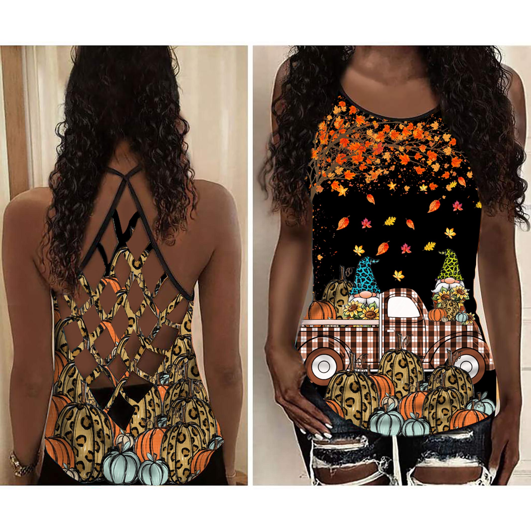 Animal Skin Pumpkins And Dwarf Gnome Tank Top Shirt Women – Autumn Cross Open Back Camisole Tank