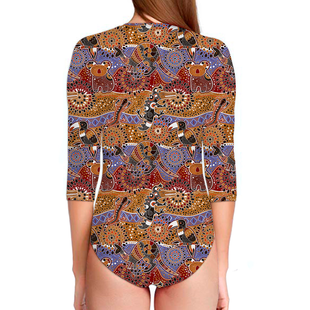 Australian Animals Pattern Print Long Sleeve One Piece Swimsuit