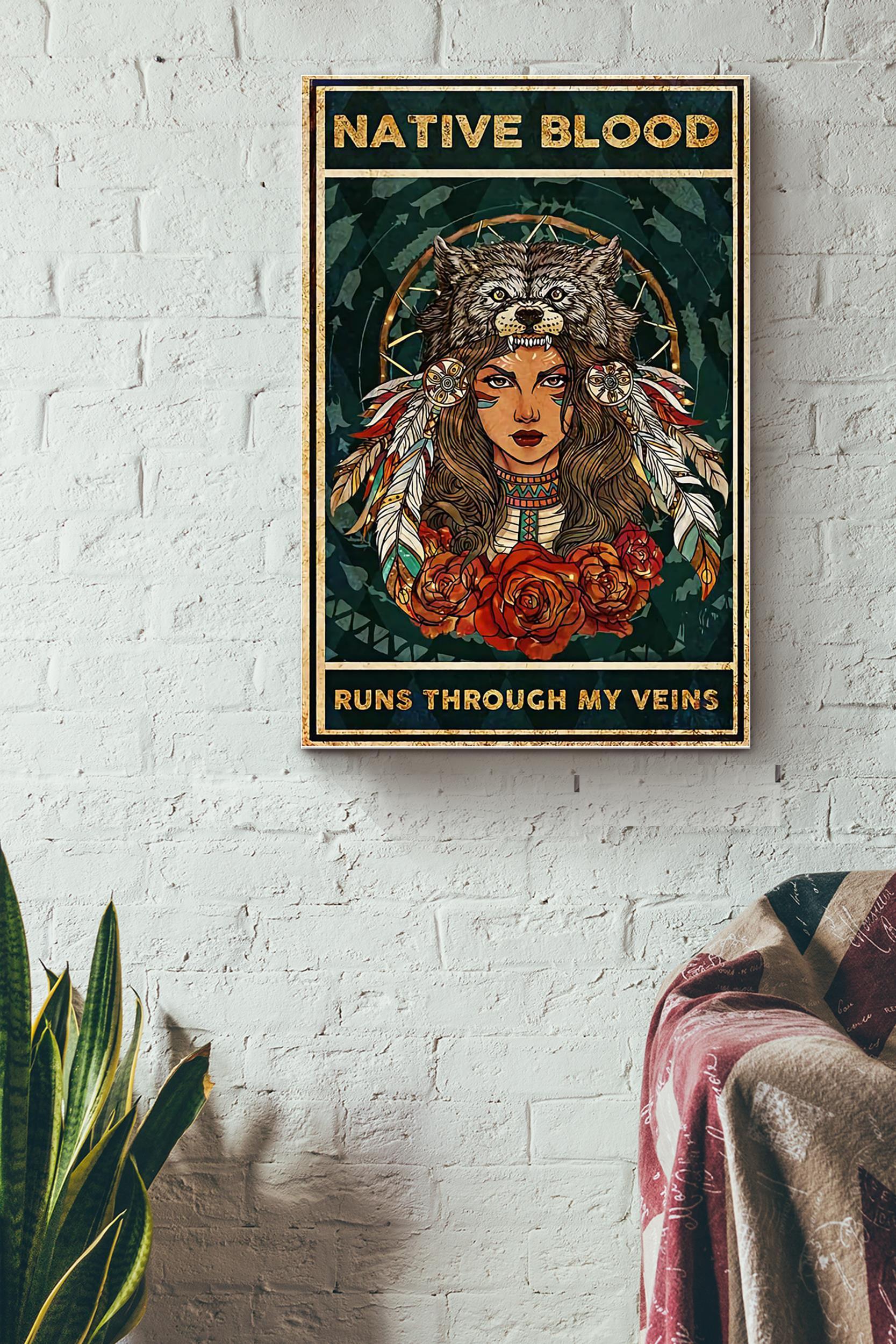 Native American Girl Native Blood Runs Through My Weins – Native American Wall Art Canvas – Gift For Girl Female Women Girlfriend Native American Lover Local Cultrure Lover Wolf Lover Animal Lover (Unframed) Poster