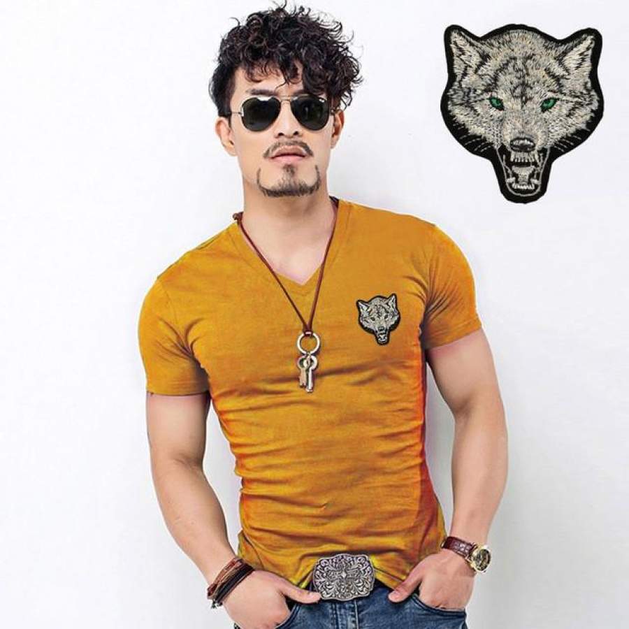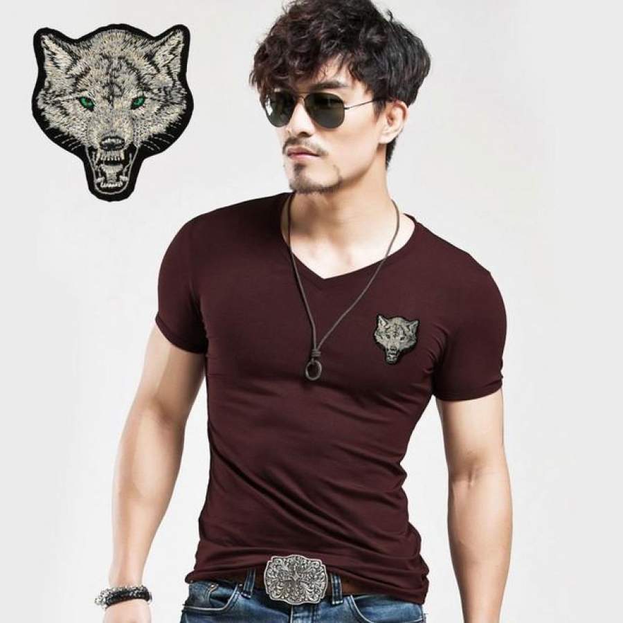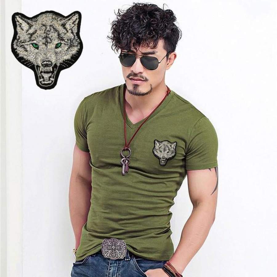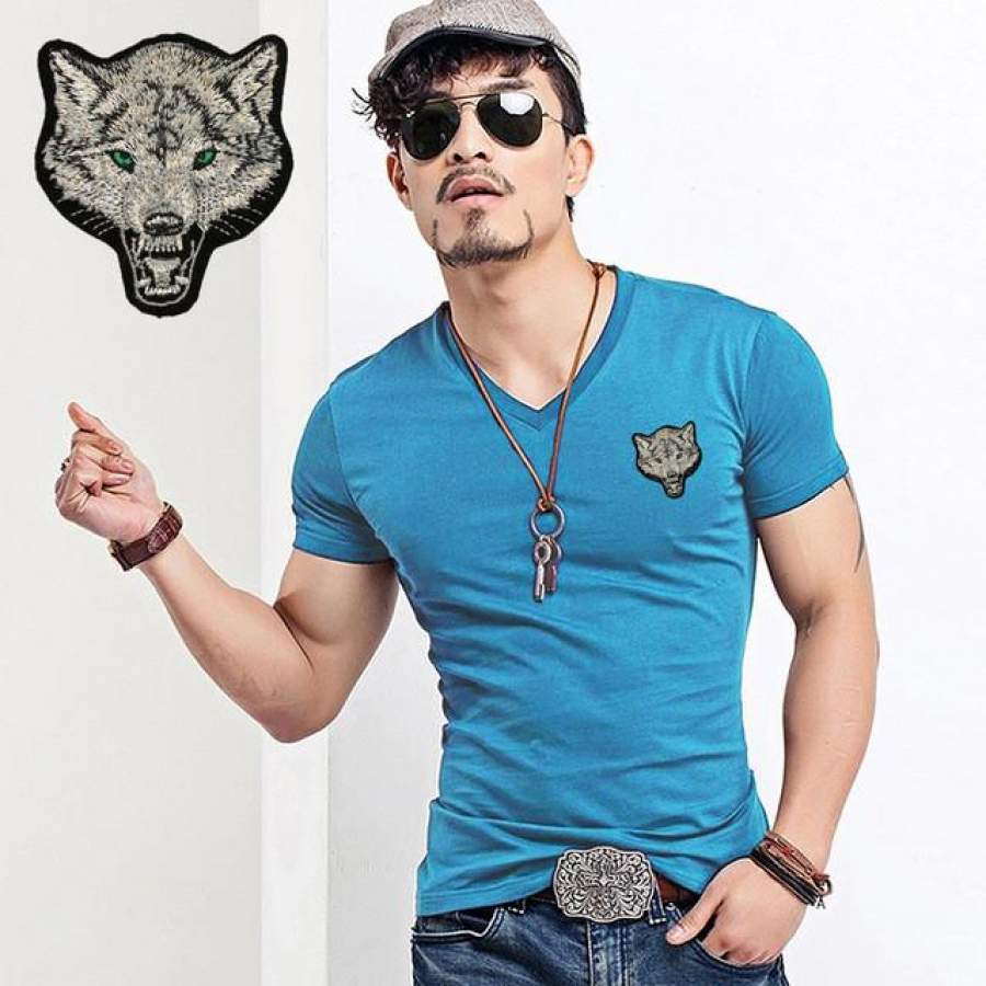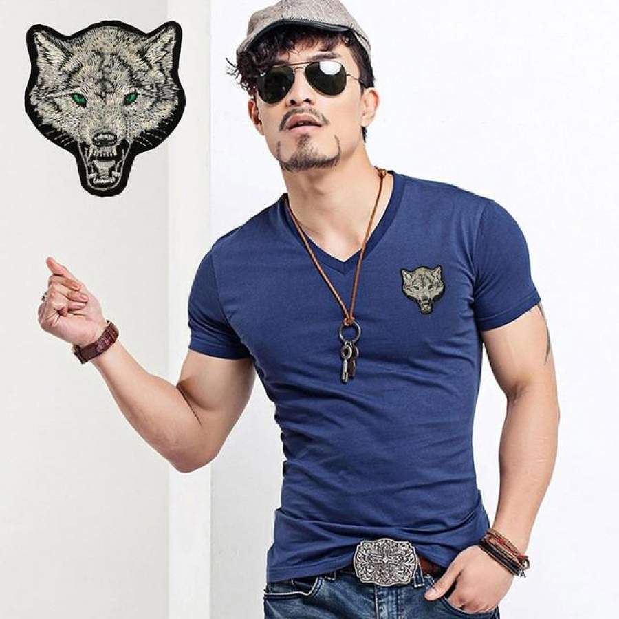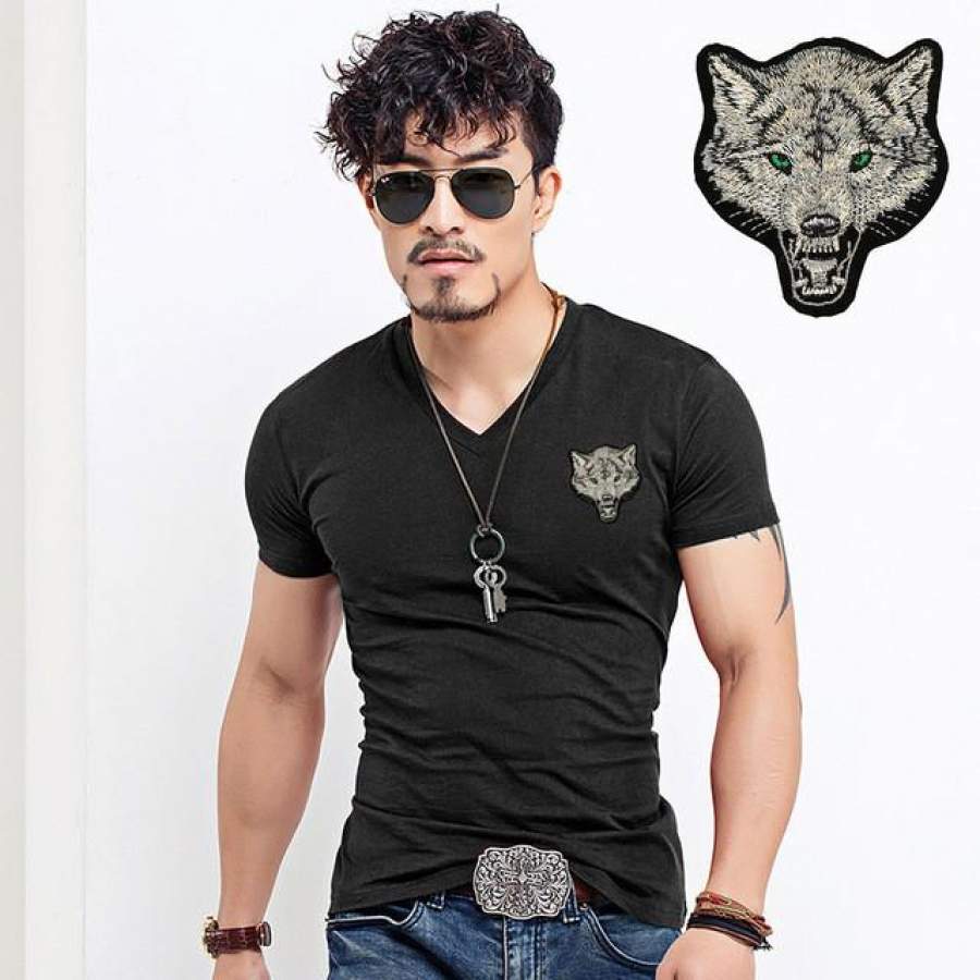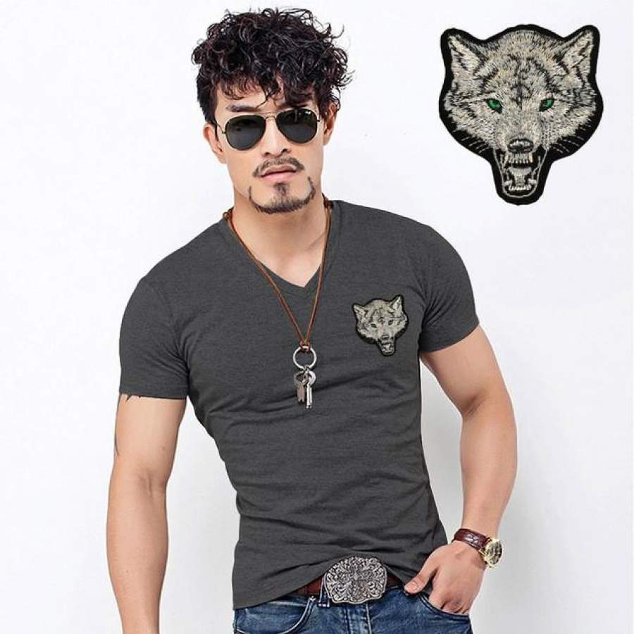 New Casual Men’s Wolf T-shirts V Neck Short Sleeve Cotton embroidery Animal T shirt Men Tee Shirts