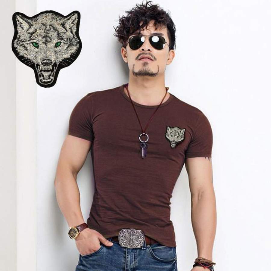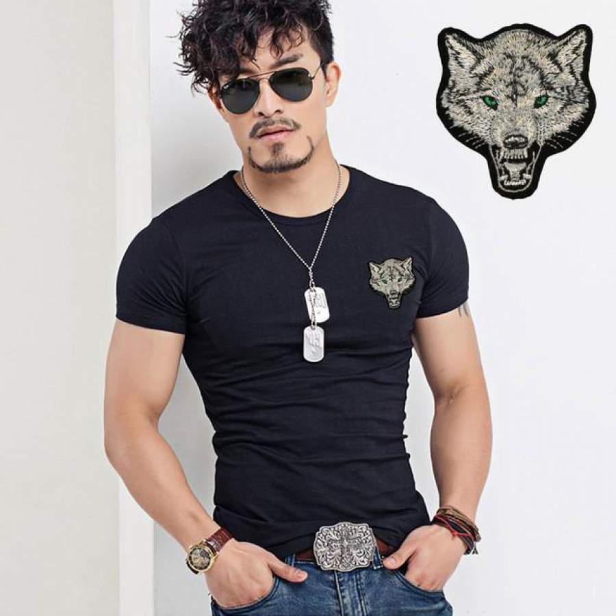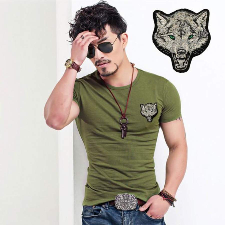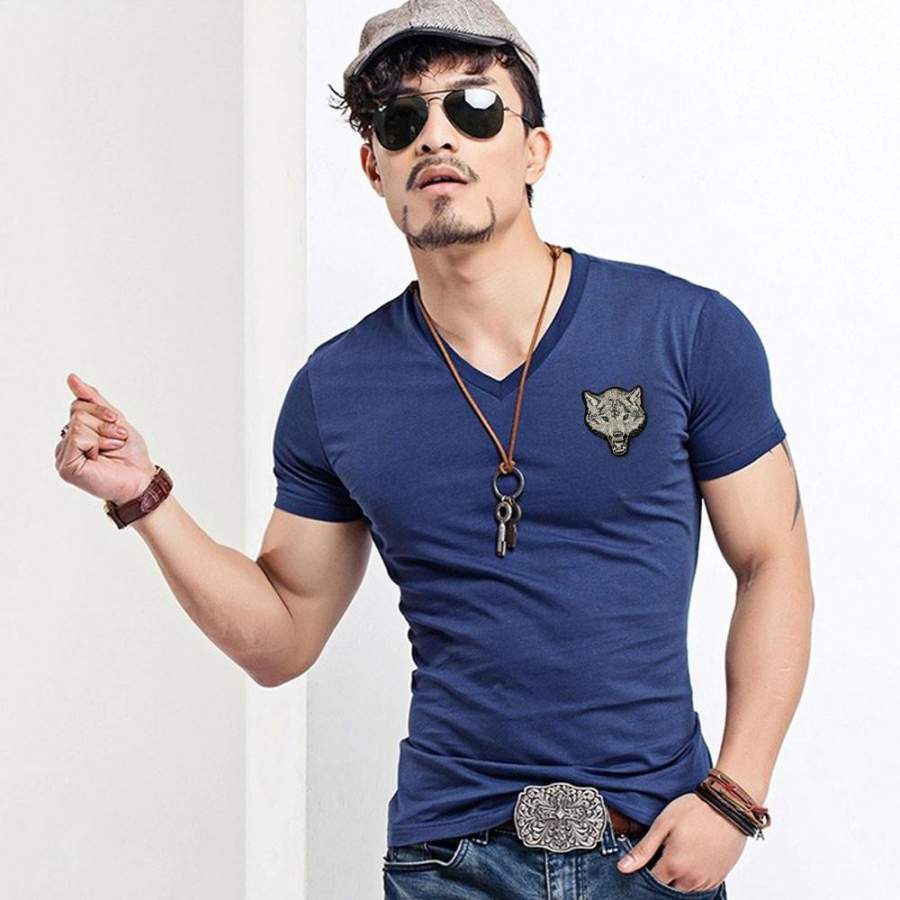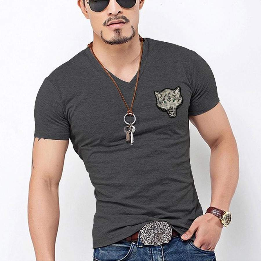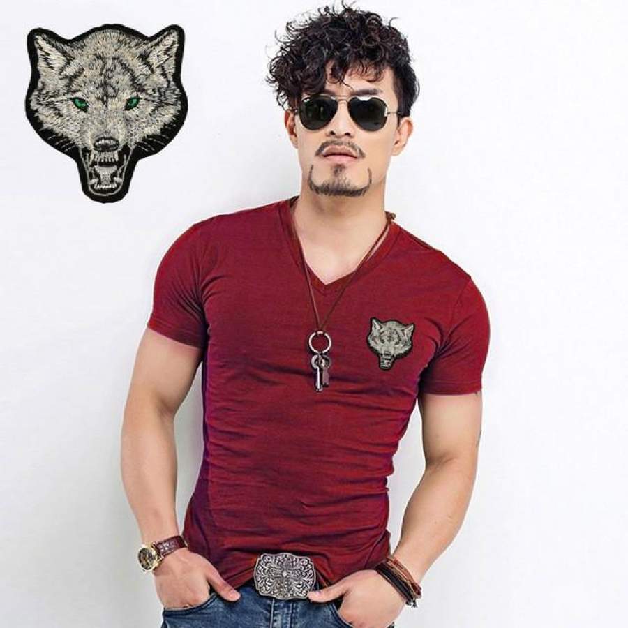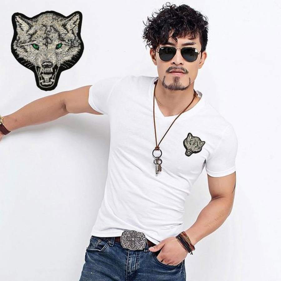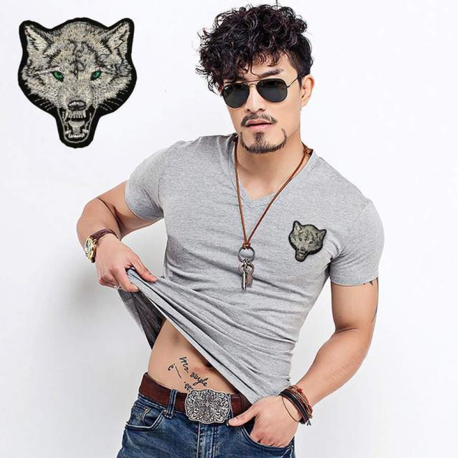 New Casual Men’s Wolf T-shirts V Neck Short Sleeve Cotton embroidery Animal T shirt Men Tee Shirts