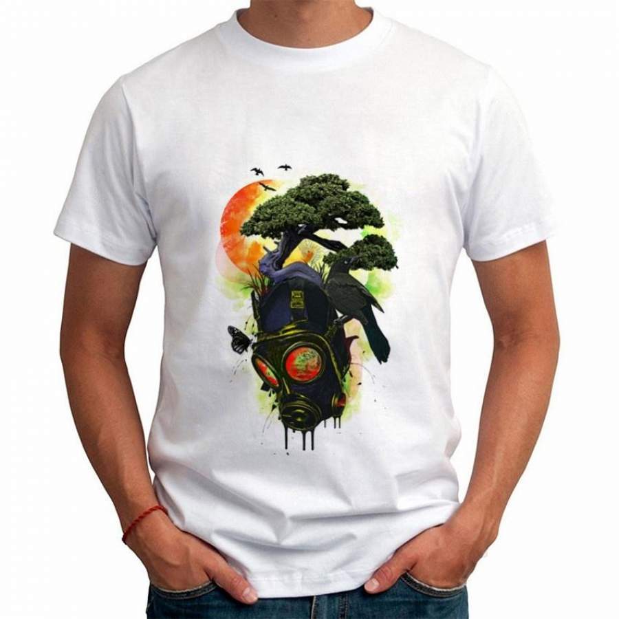 New Men’S Fashion Summer Short Sleeves O-Neck Tee Shirt Animal And Tree Print White T-Shirt
